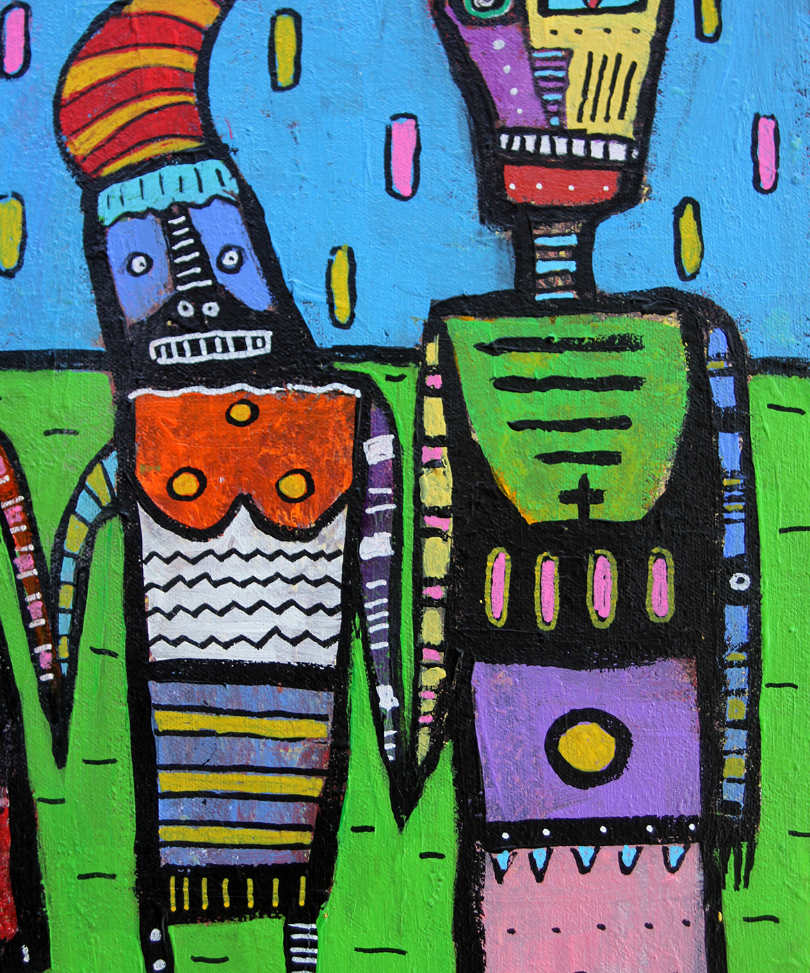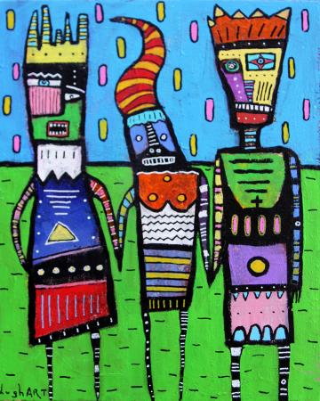 The painting is rendered in a bold, naive style reminiscent of folk art or outsider art. The color palette is incredibly bright and saturated, with contrasting hues that create a striking visual effect.